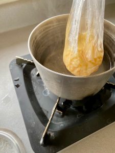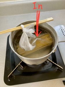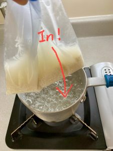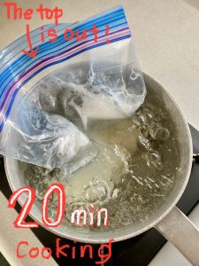 You might have to use river water or sea water as your boiling water. Make sure the bag is completely sealed, and it’s better if the top of your bag does not touch the boiling water. Boil for 20 minutes. The plastic bag should not be completely submerged in the boiling water. Then after removing the bag from the boiling water, let it sit for 10 minutes.