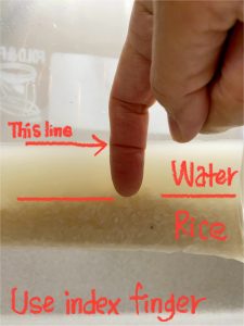 If you have a measuring cup, it’s easy to measure out the appropriate amount of water. But in an emergency, what if we don’t have a measuring cup? You’ll need to use your finger, or just eyeball it, to check your water level for steaming rice. The water level should be above the rice to about the depth of the first knuckle of your index finger.