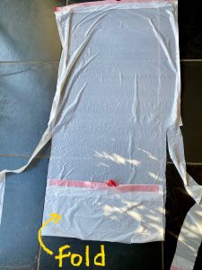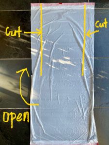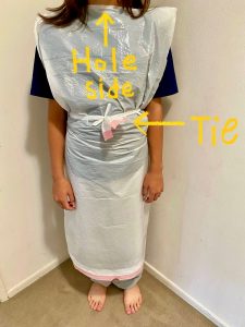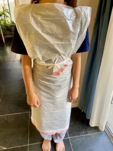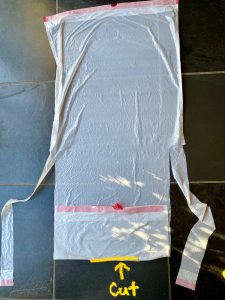 I use a 13 gallon trash bag to make an apron. Cut along the sides, cut two strips to make a belt, and finally cut a hole to poke your head through.